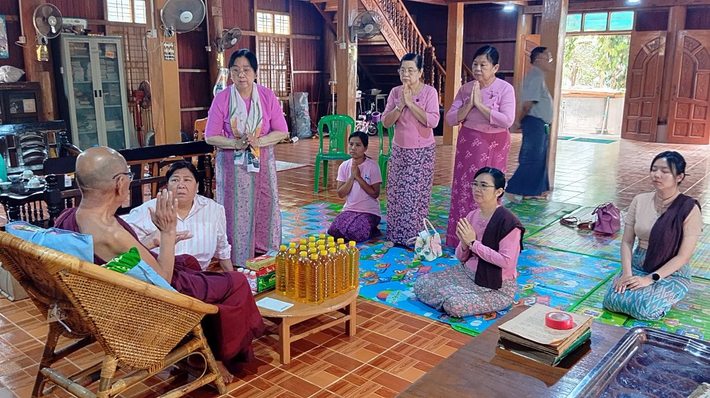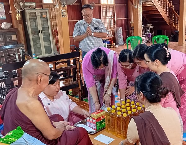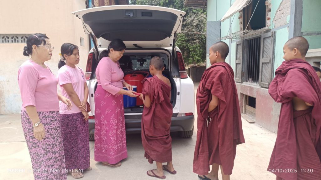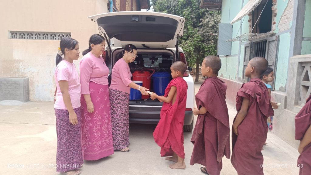 ၁၀.၄.၂၅ ရက်နေ့တွင် မြန်မာနိုင်ငံ အမျိုးသမီးများနှင့်ကလေးသူငယ်များ ဘဝမြှင့်တင်ရေးအသင်းမှ အတွင်းရေးမှူးနှင့် ဗဟိုအလုပ်အမှုဆောင်များသည် ဥတ္တရသီရိမြို့နယ်၊ မင်းကုန်းအုပ်စု၊ သဲကျွန်းကျေးရွာ ရတနာစံပြ(ဘ.က)ကျောင်းသို့သွားရောက်ကာ ကျောင်းထိုင်ဆရာတော်အားဖူးမျှော်၍ ငလျင်ဒဏ်ကြောင့်ပျက်စီးခဲ့သည့် ဆရာတော်ကြီးနှင့်သံဃာတော်များ သီတင်းသုံးသည့်ကျောင်းဆောင် (၁)ဆောင်ပြန်လည်ပြုပြင်ဆောက်လုပ်ရန်အတွက် နဝကမ္မအလှူငွေ ၁၀ သိန်းကျပ်နှင့် ဆီ ၁၀ ပိဿာ၊ ငှက်သိုက်ဗူး၊ ကြက်ပေါင်းဗူး၊ ဆေးဝါးများ လှူဒါန်းပြီးနောက်အသင်း ဗဟိုအလုပ်အမှုဆောင် မိသားစုက သံဃာတော်များနှင့်အလုပ်သမားအဖွဲ့အား ရေခဲထုပ်များ ကုသိုလ်ပြုခဲ့ကြပါသည်။