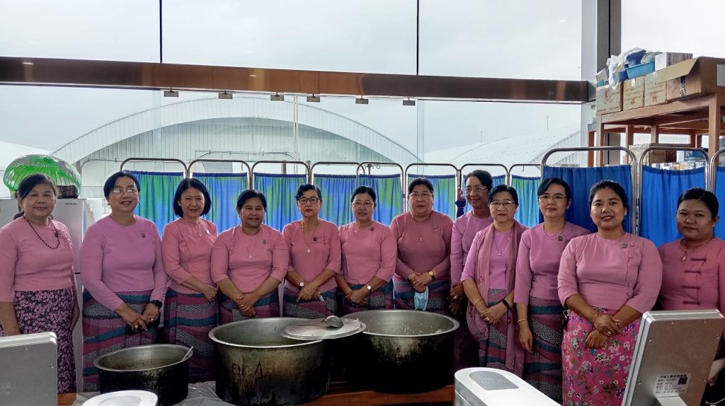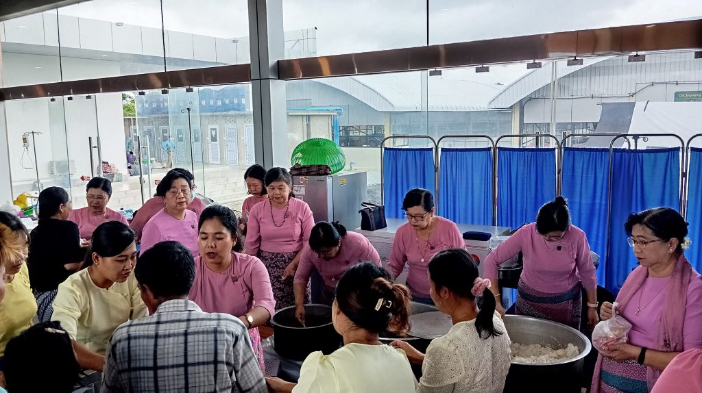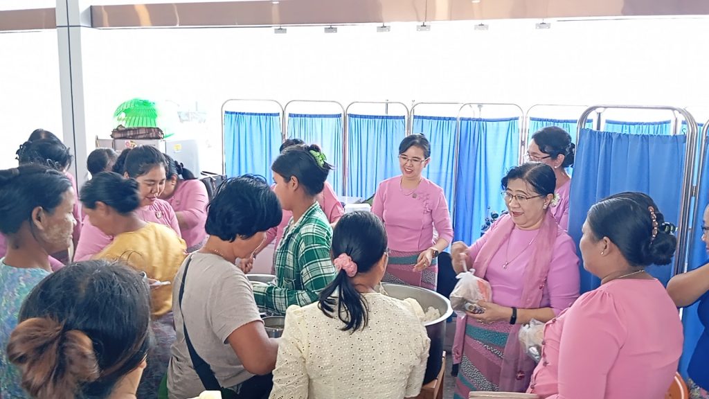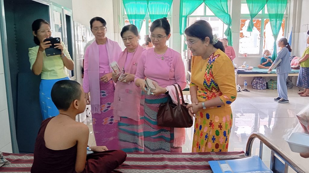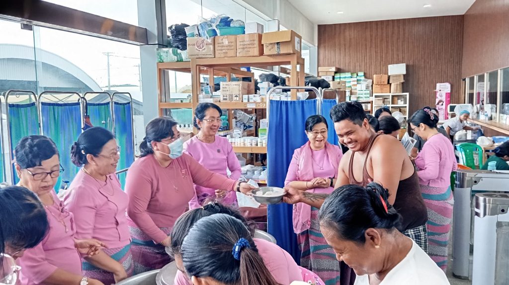 ၂၃.၆.၂၀၂၅ ရက်နေ့တွင် မြန်မာနိုင်ငံ အမျိုးသမီးများနှင့်ကလေးသူငယ်များ ဘဝမြှင့်တင်ရေးအသင်းမှ ဥက္ကဋ္ဌ၊ ဒုဥက္ကဋ္ဌ၊ အတွင်းရေးမှူးနှင့် အလုပ်အမှုဆောင်များသည် ဒက္ခိဏသီရိမြို့နယ်၊ ကျောက်မျက်ပြကွင်းတွင် ပြောင်းရွှေ့ဖွင့်လှစ်ထားသော သားဖွားမီးယပ်အထူးကုဆေးရုံကြီး ယာယီဆေးရုံတွင် ဆေးဝါးကုသနေသော အမျိုးသမီးလူနာများနှင့် မီးဖွားမိခင်များ နေ့လည်စာအာဟာရအတွက် ထမင်း၊ ကြက်သားဟင်း၊ ချဉ်ရည်ဟင်းနှင့် ခေါက်ဆွဲခြောက်ထုပ်၊ ကော်ဖီမစ်ထုပ်၊ ဘီစကစ်မုန့်တို့ကိုလည်း လက်ရောက်ပေးဝေလှူဒါန်းခဲ့ပါသည်။