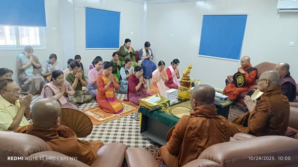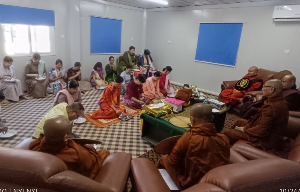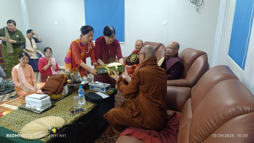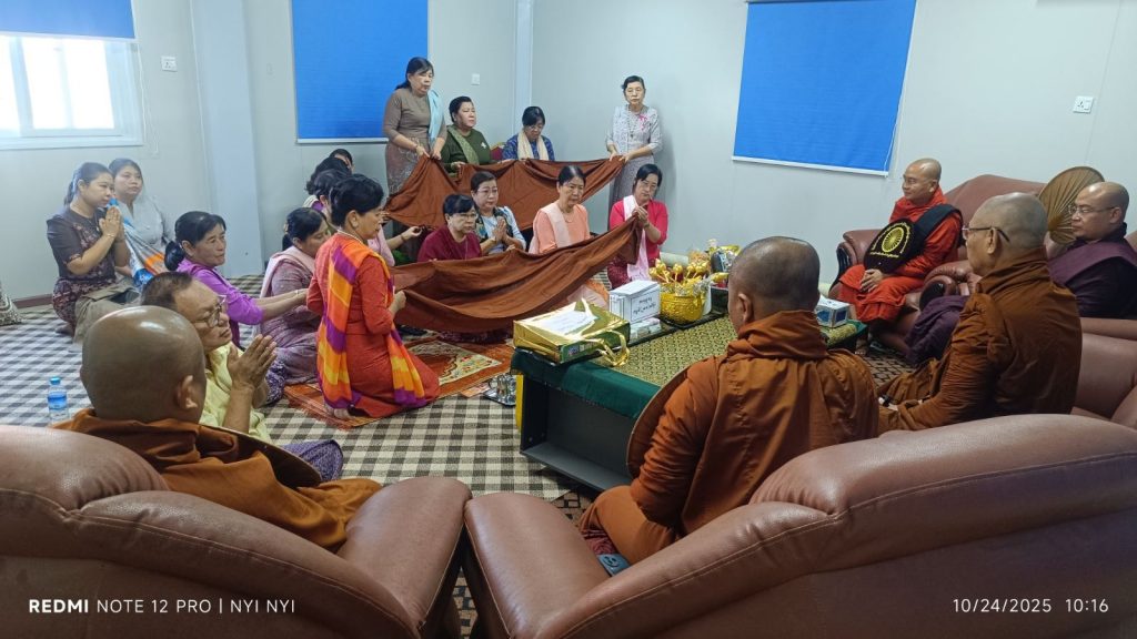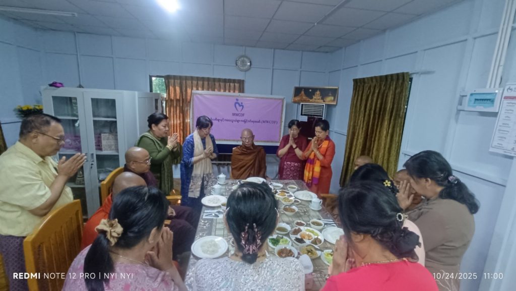 မြန်မာနိုင်ငံ အမျိုးသမီးများနှင့်ကလေးသူငယ်များ ဘဝမြှင့်တင်ရေးအသင်း(MWCDF)နှင့် ဗဟိုအလုပ်အမှုဆောင်အဖွဲ့ဝင်များ၏ (အဌမအကြိမ်) စုပေါင်းမဟာဘုံကထိန် အလှူတော်မင်္ဂလာအခမ်းအနားကို ကျောင်းထိုင်ဆရာတော်နှင့် သံဃာတော်အရှင်သူမြတ် ၅ ပါးပင့်ဖိတ်ပြီး ၂၄.၁၀.၂၀၂၅ ရက်နေ့တွင် နေပြည်တော်၊ MWCDF ရုံးချုပ်၌ကျင်းပပြုလုပ်ခဲ့ပါသည်။ အခမ်းအနားတွင် MWCDF အသင်းမှ ဥက္ကဌ၊ ဒုဥက္ကဌ (၁)၊ ဒုဥက္ကဌ (၂)၊ ဗဟိုအလုပ်အမှုဆောင်များနှင့် အသင်းရုံးဝန်ထမ်းများက ကျောင်းထိုင်ဆရာတော်ထံမှ ငါးပါးသီလခံယူဆောက်တည်ခြင်း၊ ပရိတ်တရားနာယူခြင်း၊ ကထိန်ညှပ်ကြီးသင်္ကန်းဆက်ကပ်လှူဒါန်းခြင်းနှင့် လှူဖွယ်ဝတ္ထုပစ္စည်းများဆက်ကပ်လှူဒါန်းပြီး ရေစက်သွန်ချ အမျှပေးဝေခဲ့ကြပါသည်။ ထို့နောက် သံဃာတော်အရှင်သူမြတ်တို့အား နေ့ဆွမ်းနှင့် အချိုပွဲများ ဆက်ကပ်လှူဒါန်းခဲ့ကြပါသည်။