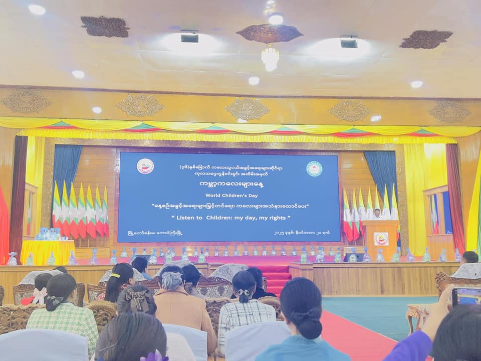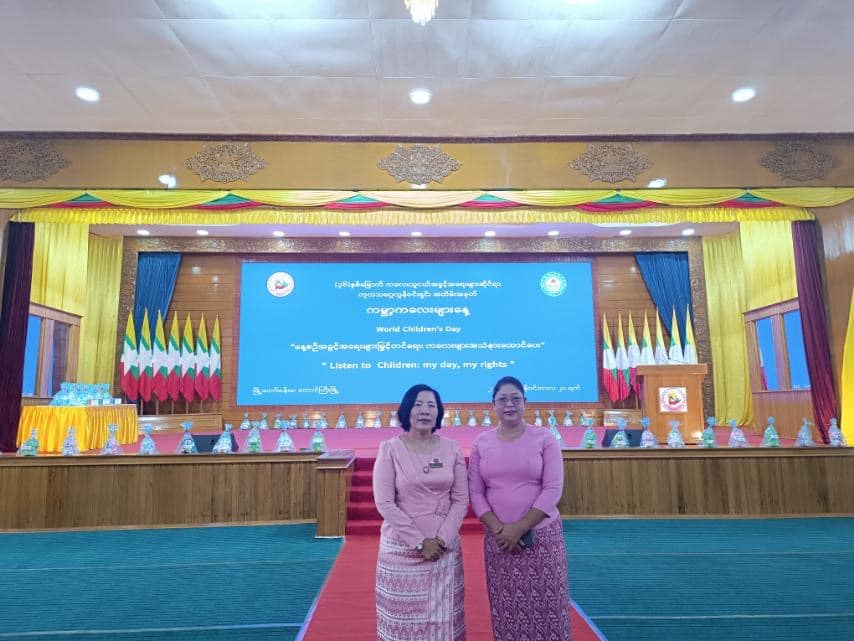 ရှမ်းပြည်နယ်(တောင်ပိုင်း) အမျိုးသမီးများနှင့်ကလေးသူငယ်များ ဘဝမြှင့်တင်ရေးအသင်းမှ ဥက္ကဌ ဒေါ်ကေသီအောင် နှင့် အတွင်းရေးမှူး ဒေါ်မြတ်မြတ်မိုးတို့သည် ၂၀.၁၁.၂၀၂၅ ရက်နေ့တွင် တောင်ကြီးမြို့၊ မြို့တော်ခန်းမ၌ ကျင်းပပြုလုပ်သော (၃၆)နှစ်မြောက် ကလေးသူငယ်အခွင့်အရေးများဆိုင်ရာ ကုလသမဂ္ဂကွန်ဗင်းရှင်း အထိမ်းအမှတ် “ ကမ္ဘာ့ကလေးများနေ့” အခမ်းအနားကို တက်ရောက်ခဲ့ပါသည်။
