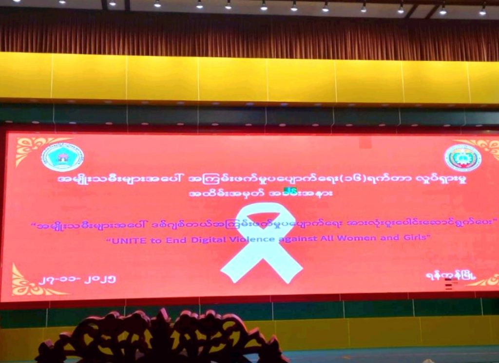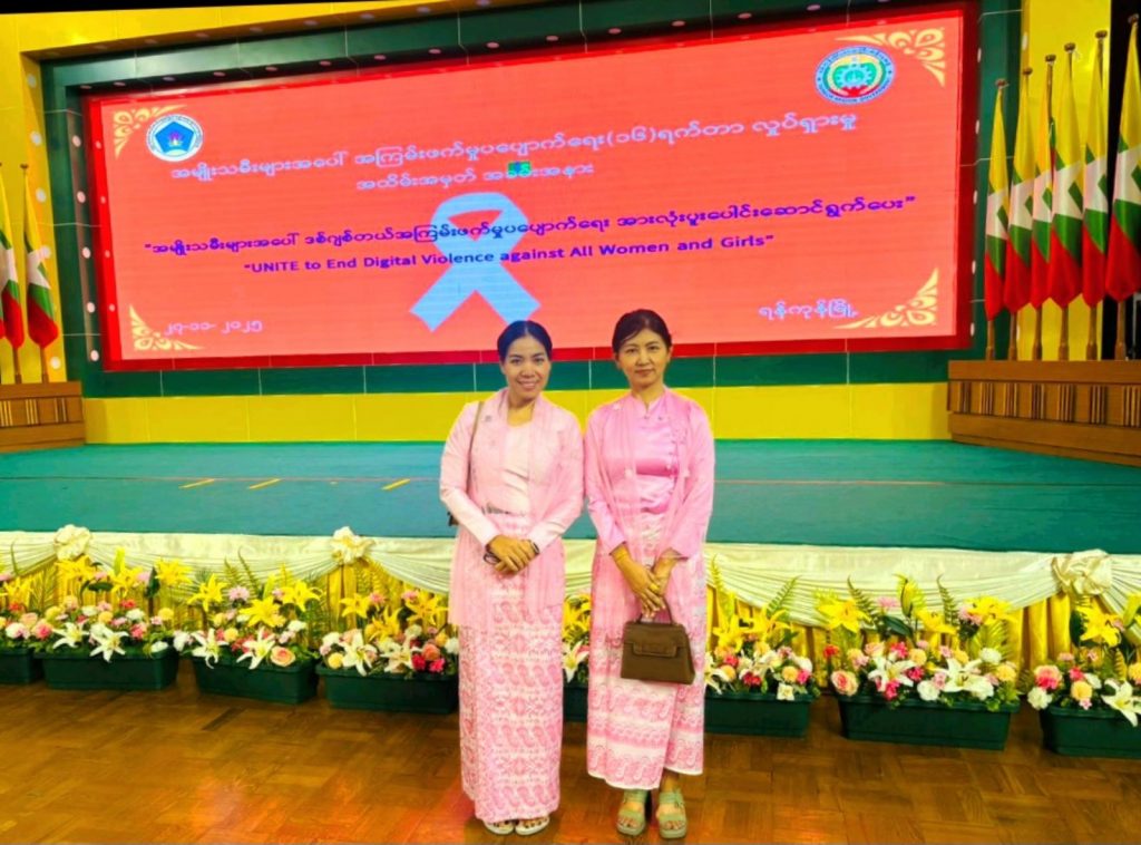 ရန်ကုန်တိုင်း အမျိုးသမီးများနှင့်ကလေးသူငယ်များ ဘဝမြှင့်တင်ရေးအသင်းမှ တွဲဖက်အတွင်းရေးမှူးနှင့် အလုပ်အမှုဆောင် ၂ ဦးတို့သည် ၂၇.၁၁.၂၀၂၅ ရက်နေ့တွင် ရန်ကုန်တိုင်းဒေသကြီးအစိုးရအဖွဲ့ရုံး မင်္ဂလာခန်းမတွင် ကျင်းပပြုလုပ်သော ၂၀၂၅ ခုနှစ်၊ အမျိုးသမီးများအပေါ် အကြမ်းဖက်မှုပပျောက်ရေး (၁၆)ရက်တာ လှုပ်ရှားမှုအခမ်းအနားသို့ တက်ရောက်ခဲ့ပါသည်။